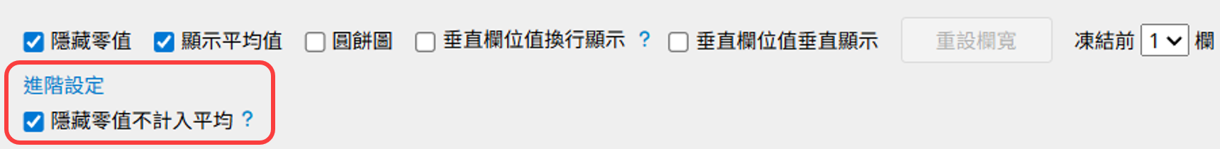 當「隱藏零值」和「顯示平均值」同時勾選時,可以在進階設定勾選「隱藏零值不計入平均」,勾選後,平均值計算只會包含畫面上看到的數字,被隱藏的零值將不計入平均。