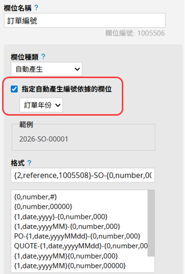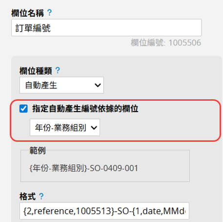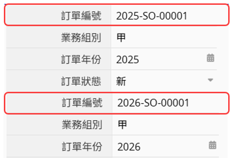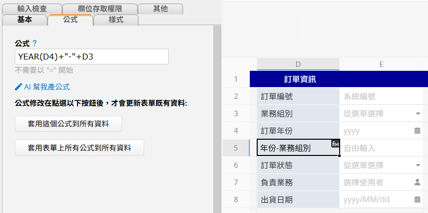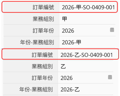 假設表單中有一個自由輸入欄位,透過公式將「訂單年份」與「業務組別」組合為「年份-業務組別」(例如:2026-甲)。