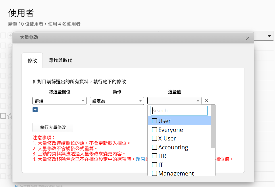 除了在表單頁中修改使用者資料外,你也可以在使用者表單的列表頁透過大量修改一次更新多筆使用者資料(列表頁不支援單筆修改)。需要注意的是,由於 SYSAdmin 屬於最高權限的群組,目前不支援透過大量修改來給予或移除此群組權限。