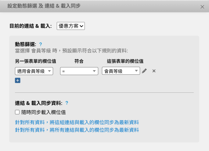 例如:表單有個欄位「會員等級」,有「VIP」跟「一般」兩種選項,當選擇「VIP」時,利用連結與載入選擇會員時就只會顯示出會員等級為「VIP」的會員,當選擇「一般」時,在連結與載入時就只會顯示出會員等級為一般的會員。所以你可以透過這項功能來幫助你只載入有需要的選項。