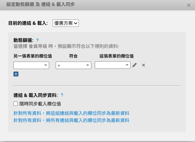 在視窗中選擇在另一張表單上的欄位值與這張表單上的欄位值並設定規則。當你選擇從另一張表單載入的資料時,就只會顯示符合規則的資料。按+號來新增規則,也可以按右邊的鉛筆符號來輸入條件。