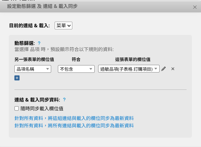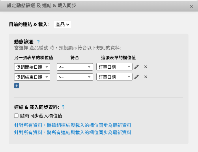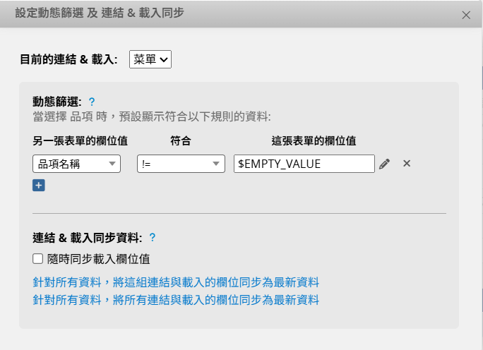 你可以在連結與載入的欄位或是型態為從其他表單選擇的欄位設定動態篩選,根據這張表單的某一欄位值來篩選在另一張表單可以選取的項目。