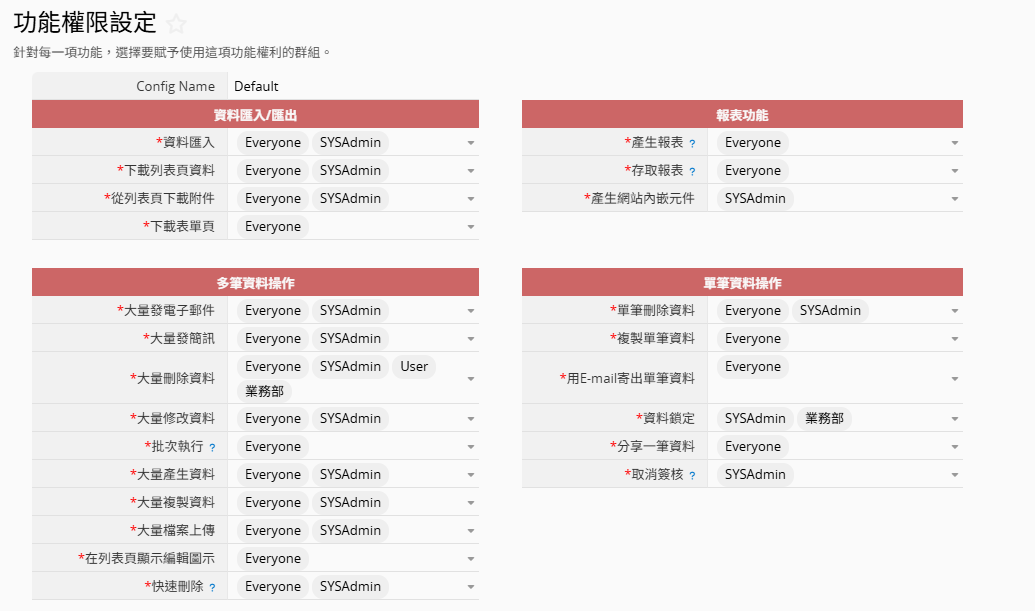 備註:沒有支援列表頁工具「編輯多筆資料」權限設定,目前只有SYSAdmin管理者或問卷式使用者(只會編輯有權限的資料)能使用。