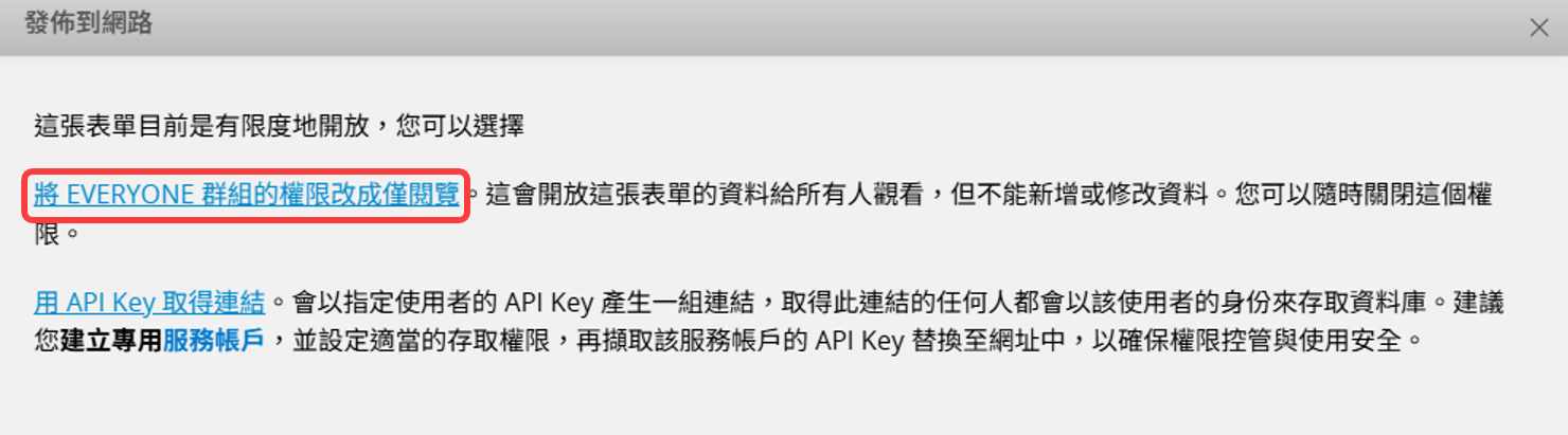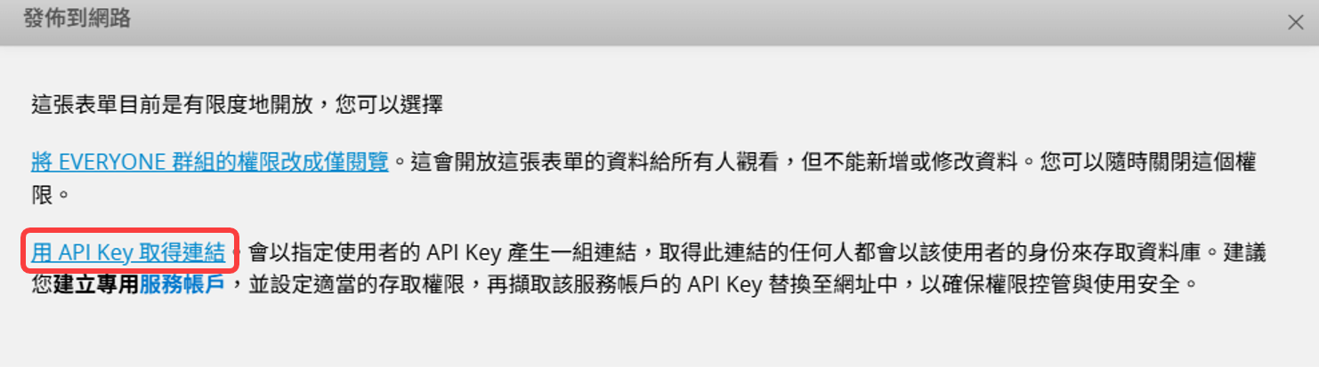 取得此連結的任何人都會以該使用者的身份來存取資料庫。建議建立專用服務帳戶,並設定適當的存取權限,再擷取該服務帳戶的 API Key 替換至網址中,以確保權限控管與使用安全。