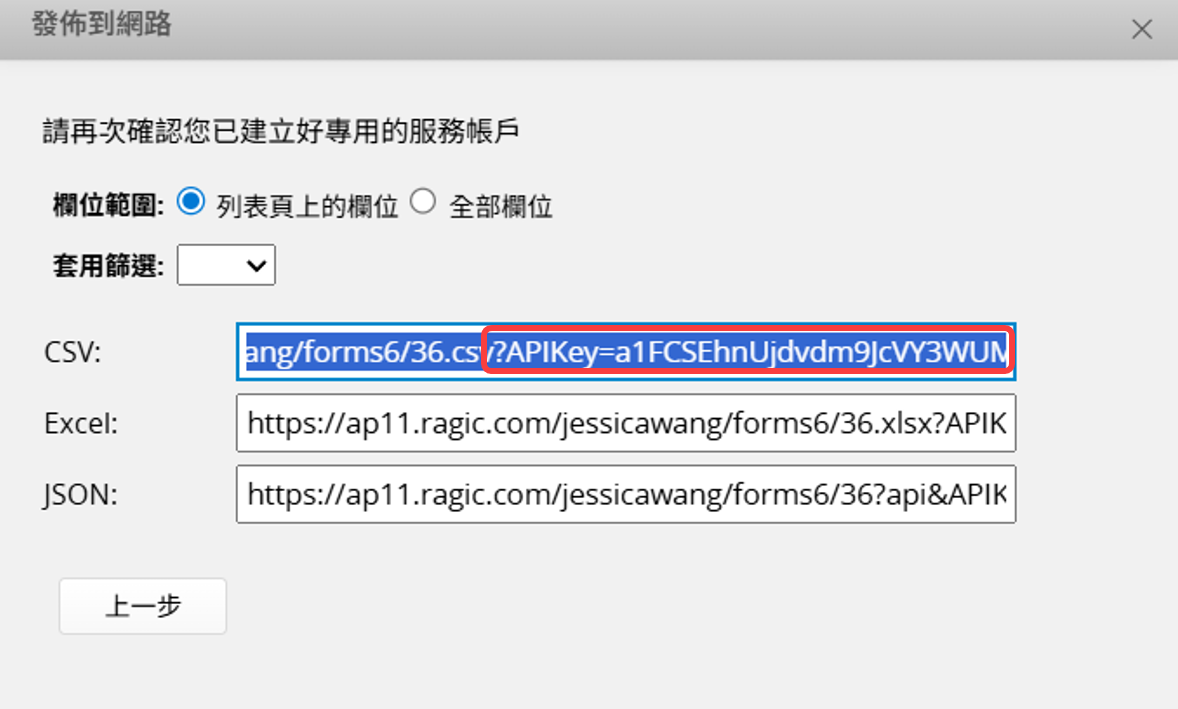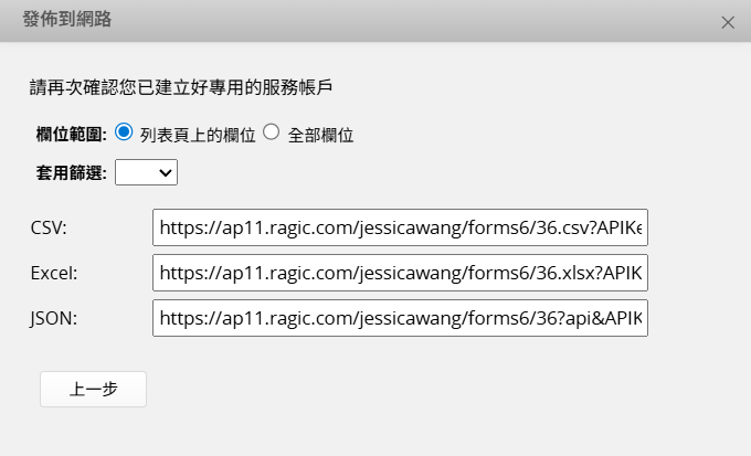 同樣可以選擇列表頁上的欄位或全部欄位以及是否套用共通篩選來決定發佈資料的範圍。