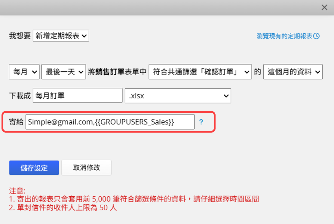 另外要注意的是,相同條件的寄出報表設定只能有一組。因此如果有不同使用者需要一樣的定期報表,請選擇更新現有的定期報表並增加收件人。