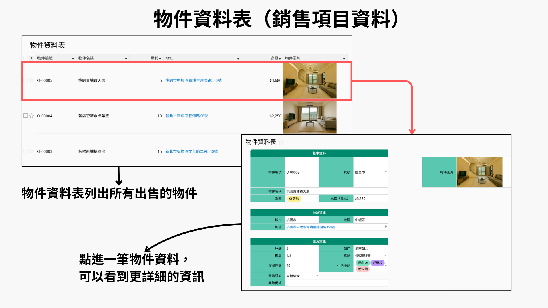 以房仲業為例,一個基本的 CRM 系統可能會有一張客戶名單列表,包含姓名、分類、來源、聯絡方式等基本資訊;點進某筆客戶資料後,還能查看更詳細的內容,例如每次帶看的紀錄或成交資訊。