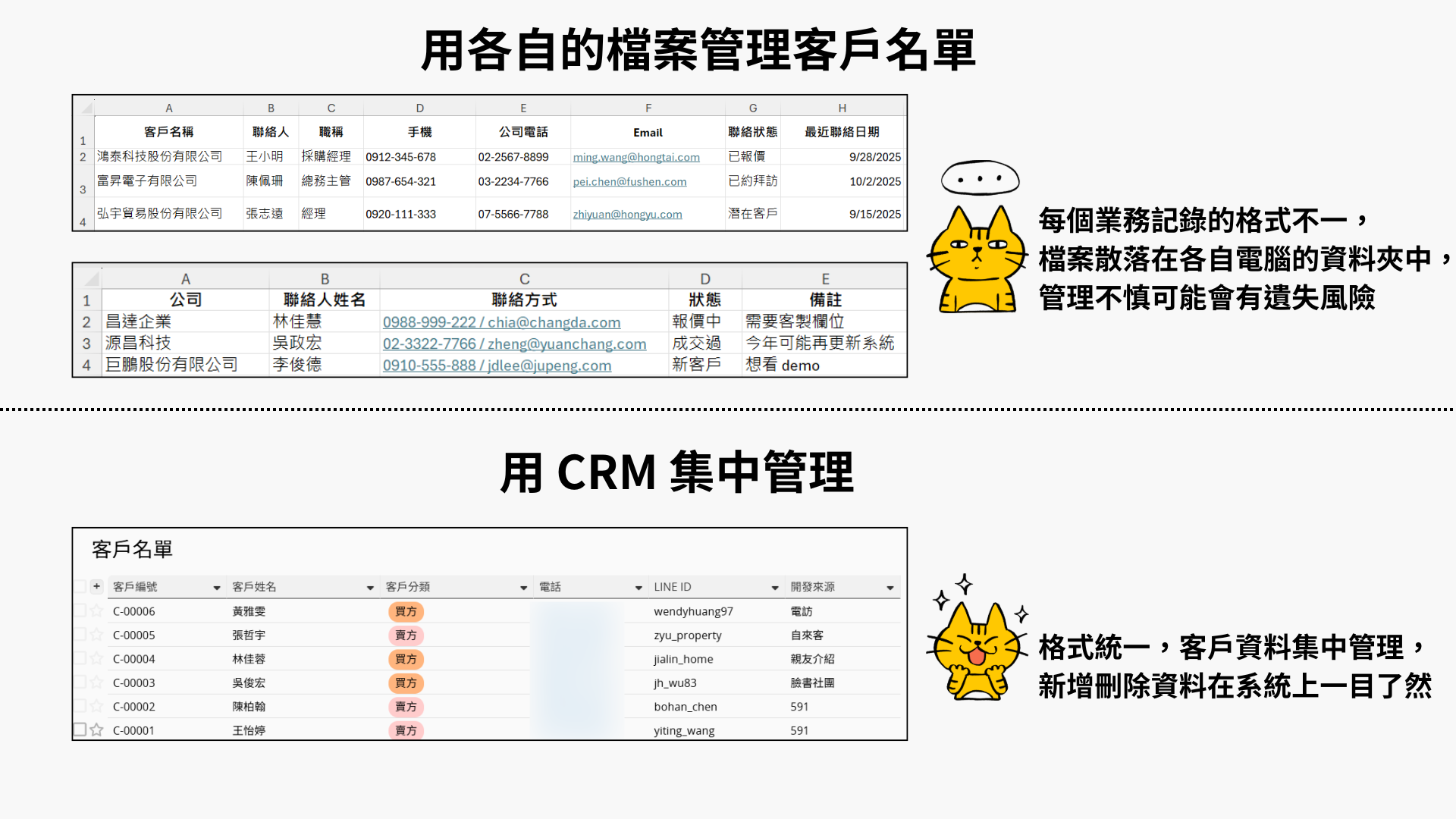 - Excel:不利於多人協作,容易變成每位業務各自留一份名單,導致資料分散、版本不一致,難以集中管理。(勤信會計師事務所就曾與我們分享過類似的實際狀況)