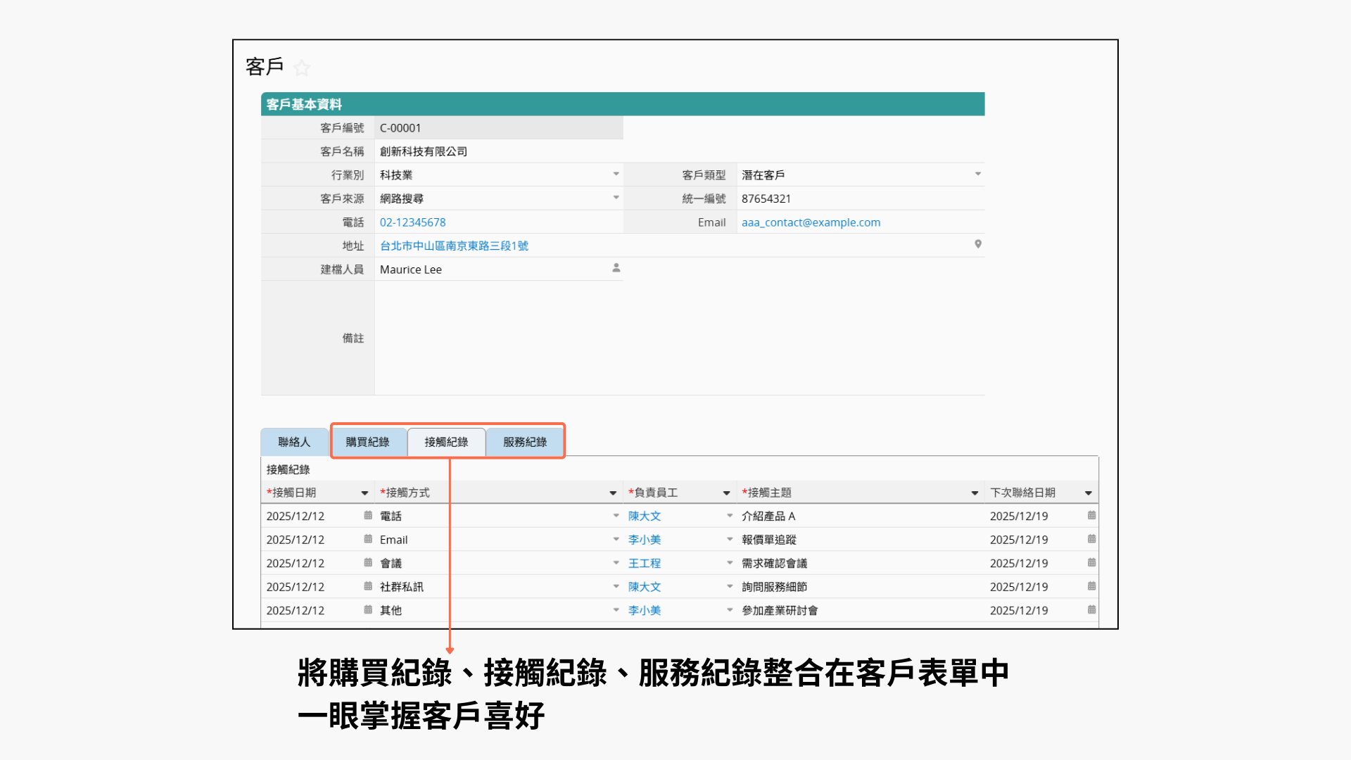 由於每筆客戶資料會列出客戶在成交或服務前、中、後期的接觸紀錄,因此常會搭配另一張資料表,來管理對應的成交或服務標的。這樣在新增接觸紀錄時,就能直接從列表中選取相關的標的,方便後續追蹤與管理。
